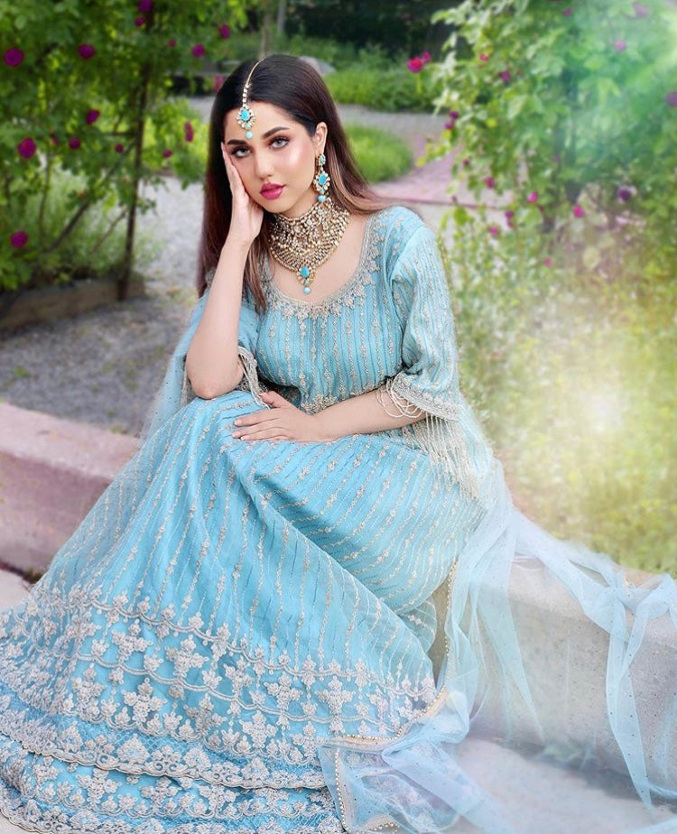 Gold plated kundan choker set with high quality sky blue stone work. comes with tikka and earrings.
